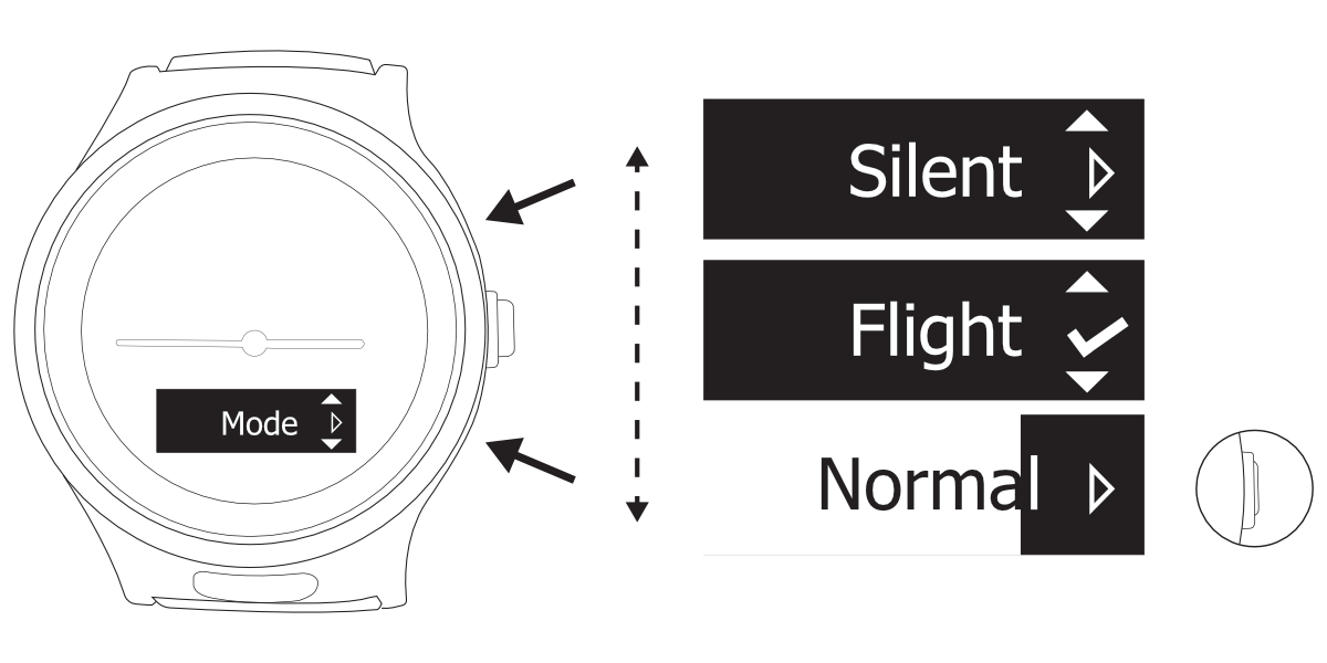 The watch hands automatically move to not obstruct viewing the display. When the display is active, you see the battery icon, mobile network icon, as well as the date and time (in recurring intervals). - Press CROWN again to enter the menu. Press CROWN to navigate through the menus until you see the Mode menu.