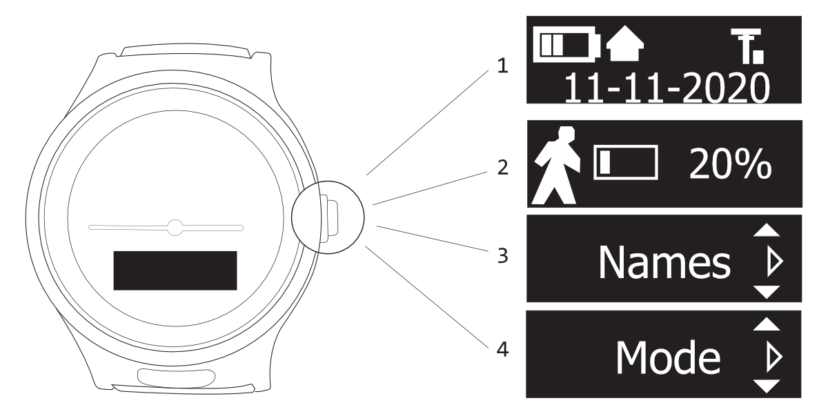 Le lancette dell'orologio si spostano automaticamente in modo tale da non ostruire la visuale. Quando il display è attivato, viene visualizzata l'icona della batteria, l'icona dellla rete mobile e la data ed ora (ad intervalli intercorrenti). - Premere ancora il pulsante CORONA per accedere al menu, la prima voce visualizzata è Nomi. Premere ulteriormente la CORONA fino a quando nel menù compare la dicitura Modo.